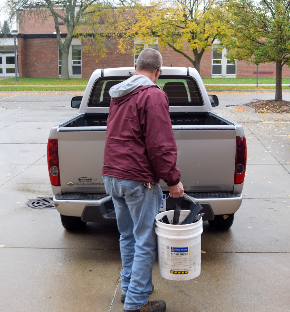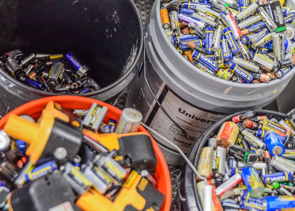 Mostly leaving battery pick-ups to his student workers, Long has them separate the batteries by lithium and alkaline for proper disposal protection. (See Photo 1, 4, 8.) There is also a bucket full of sand nearby in case any battery fills with fluid and starts a fire.