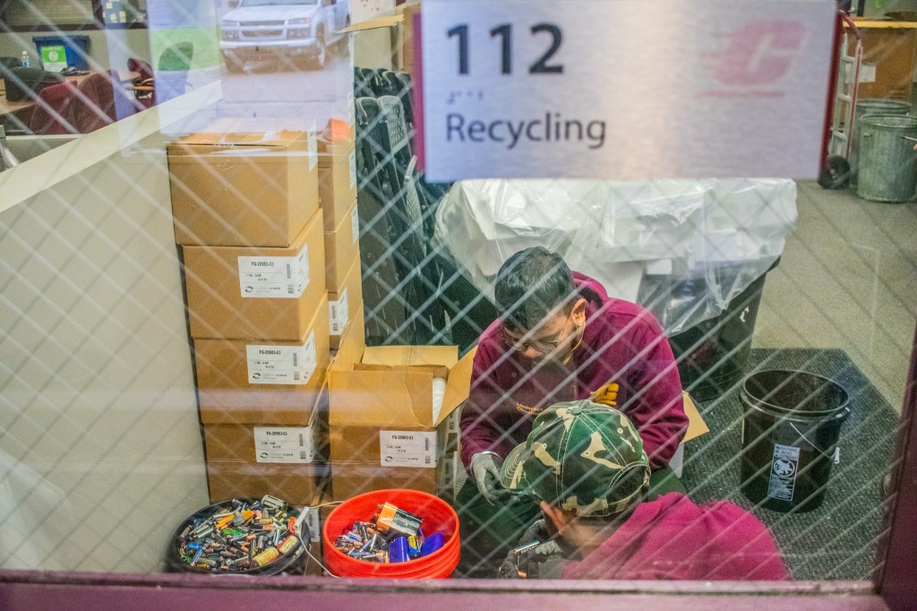 A key part of keeping recycling bins around campus is making sure to meet a state-mandated deadline by putting stickers on them, like with batteries. (See Photos 1, 4, 8.) The stickers are to make sure the materials, like the batteries, are being recycled within an appropriate or safe amount of time.